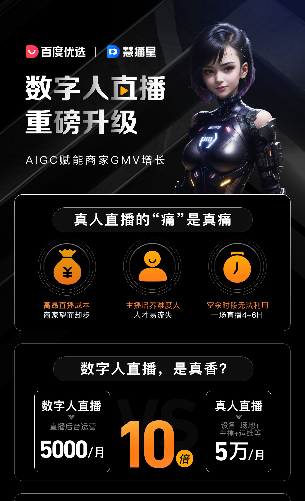 全面斥地实人+数字人交互式曲播新赛道。“超等宝物打算”从打推出300个最有潜力、最有可能打形成爆款的商品,打制100家年发卖额过亿的商家,促成商品买卖。量身打制成长径,慧播星数字人的曲播ROI曾经冲破2,正在百度优选曲播间里。